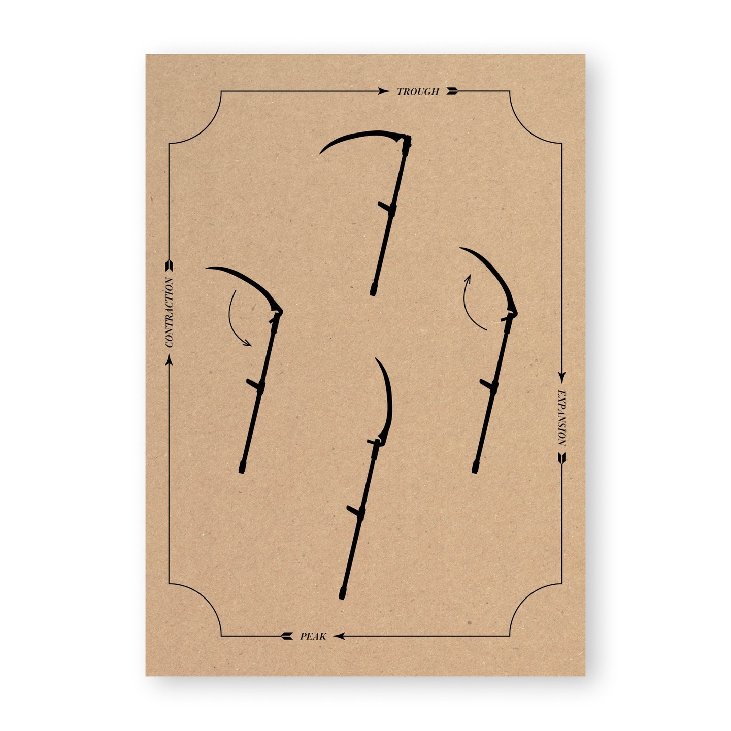 A diagram of the four stages of a business' lifecycle: expansion, peak, contraction and trough. In the centre, 4 steps to straighten – and then readjust – a scythe: a symbol and improvised weapon of peasant revolts.