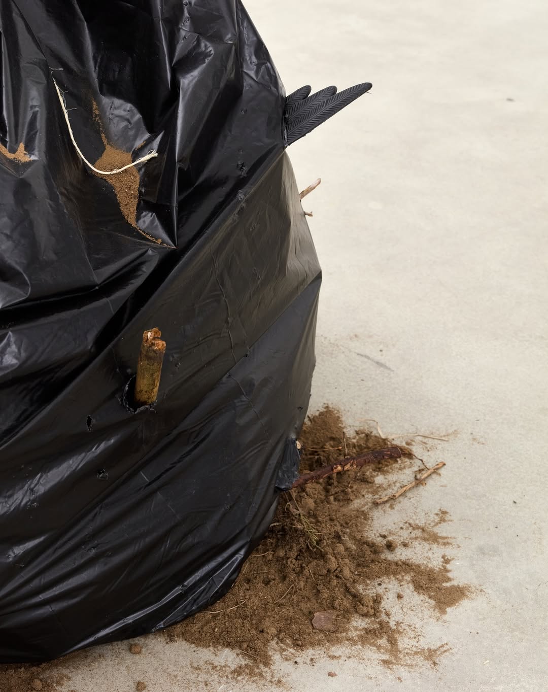 [rebar, crow decoys, clothes, soil, plant debris, rubbish bag]